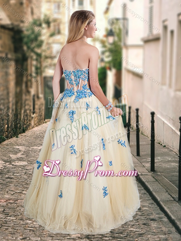 Neckline : SweetheartShown Color : ChampagneSilhouette : EmpireSleeve Length : sleevelessHemline : with trainBack Detail : ZipperFabric : TulleEmbellishment : AppliquesOccasion : Prom,Party,Cocktail,Homecoming,GraduationSeason : Spring,Summer,Fall