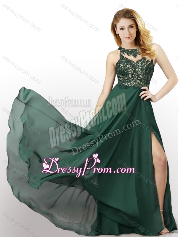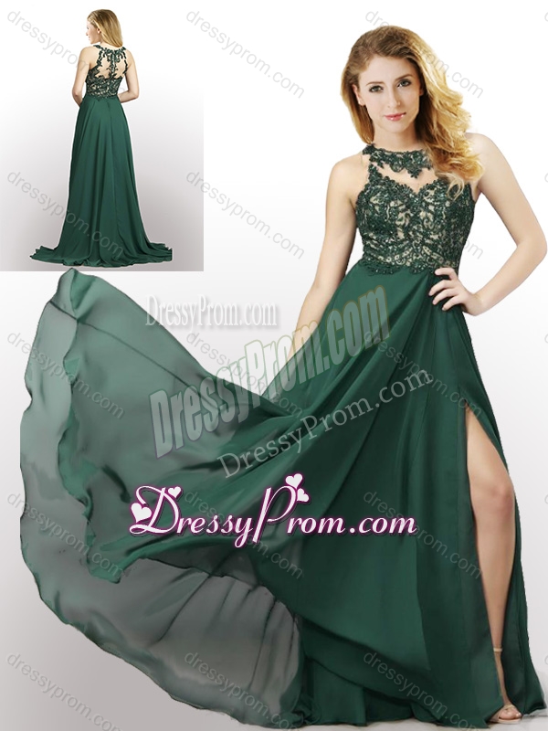 Neckline : ScoopShown Color : Dark GreenSilhouette : EmpireSleeve Length : sleevelessHemline : with trainBack Detail : ZipperFabric : ChiffonEmbellishment : LaceOccasion : Prom,Party,Cocktail,Homecoming,GraduationSeason : Spring,Summer,Fall,Winter