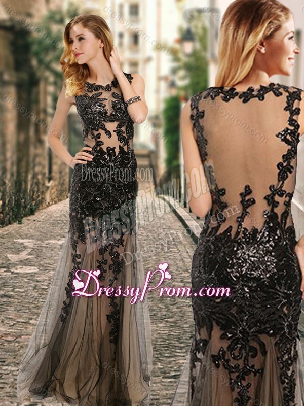 Neckline : ScoopShown Color : BlackSilhouette : Column/sheathSleeve Length : sleevelessHemline : floor lengthBack Detail : Side zipperFabric : TulleEmbellishment : AppliquesOccasion : Prom,Cocktail,Homecoming,GraduationSeason : Spring,Summer,Fall,Winter