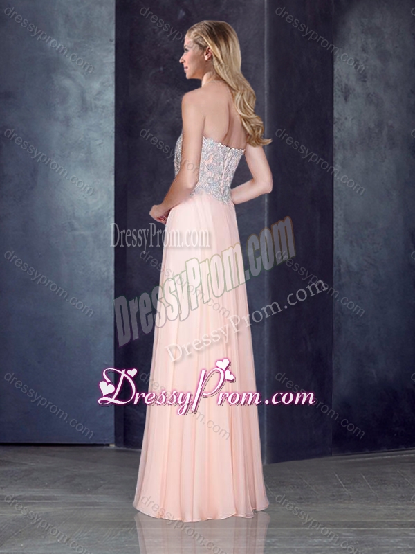 Neckline : SweetheartShown Color : Baby PinkSilhouette : EmpireSleeve Length : sleevelessHemline : floor lengthBack Detail : ZipperFabric : ChiffonEmbellishment : Beading,AppliquesOccasion : Prom,Party,Cocktail,Homecoming,GraduationSeason : Spring,Summer,Fall,Winter