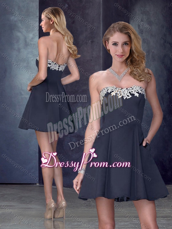 Neckline : StraplessShown Color : BlackSilhouette : EmpireSleeve Length : sleevelessHemline : mini lengthBack Detail : ZipperFabric : SatinEmbellishment : AppliquesOccasion : Prom,Party,Cocktail,Homecoming,GraduationSeason : Spring,Fall