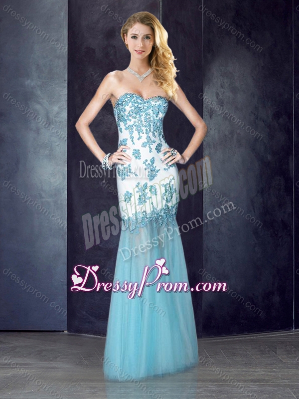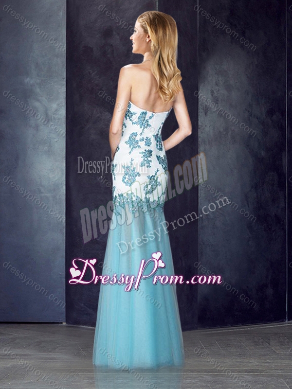 Neckline : SweetheartShown Color : Aqua BlueSilhouette : Column/SheathSleeve Length : sleevelessHemline : floor lengthBack Detail : ZipperFabric : TulleEmbellishment : AppliquesOccasion : Prom,Party,Cocktail,Homecoming,GraduationSeason : Spring,Summer,Fall,Winter