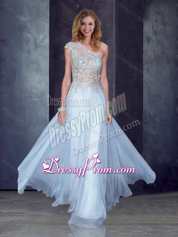 Neckline : One shoulderShown Color : Light BlueSilhouette : EmpireSleeve Length : cap sleevesHemline : floor lengthBack Detail : Side zipperFabric : ChiffonEmbellishment : AppliquesOccasion : Prom,Party,Cocktail,Homecoming,GraduationSeason : Spring,Summer,Fall,Winter