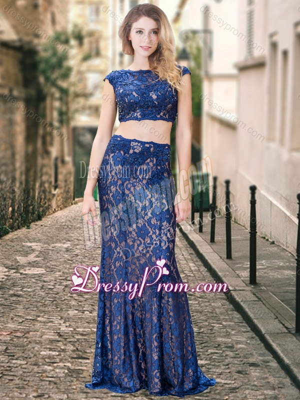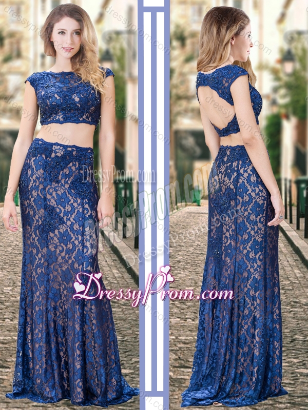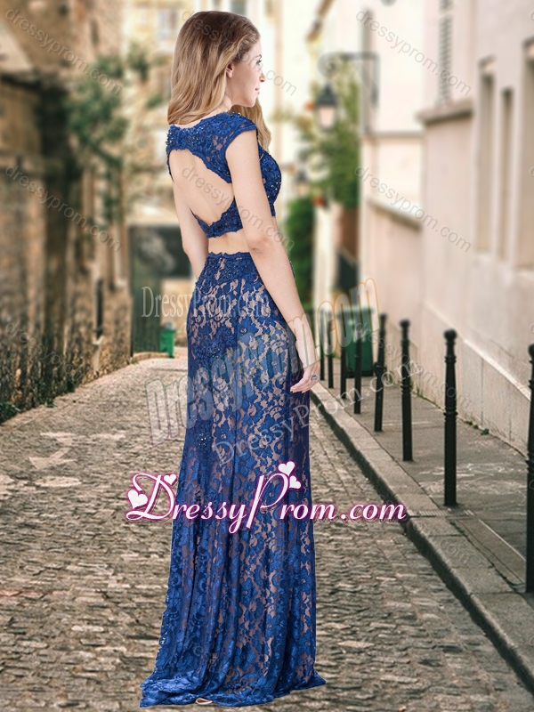 Neckline : BateauShown Color : Royal BlueSilhouette : Column/SheathSleeve Length : cap sleevesHemline : with trainBack Detail : BacklessFabric : LaceEmbellishment : LaceOccasion : Prom,Party,Cocktail,Homecoming,GraduationSeason : Spring,Summer,Fall,Winter