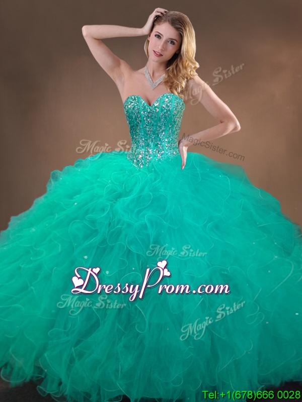 Neckline : SweetheartShown Color : TurquoiseSilhouette : Ball GownsSleeve Length : sleevelessHemline : floor lengthBack Detail : Lace upFabric : OrganzaEmbellishment : Beading,RufflesOccasion : Military Ball,Sweet 16,QuinceaneraSeason : Spring,Summer,Fall,Winter