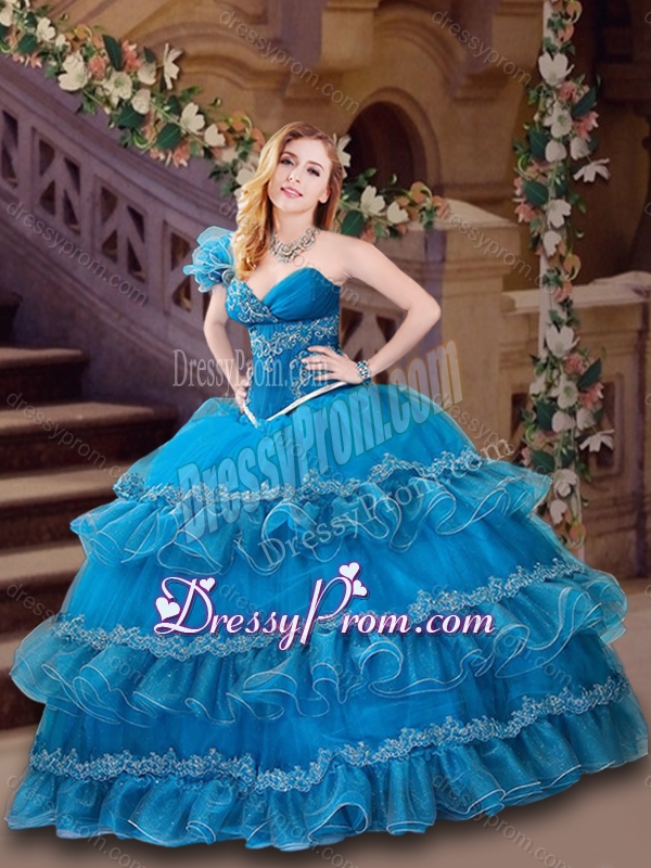 Neckline : One shoulderShown Color : BlueSilhouette : Ball GownsSleeve Length : sleevelessHemline : floor lengthBack Detail : Lace upFabric : OrganzaEmbellishment : Appliques,RufflesOccasion : Military Ball,Sweet 16,QuinceaneraSeason : Spring,Summer,Fall,Winter