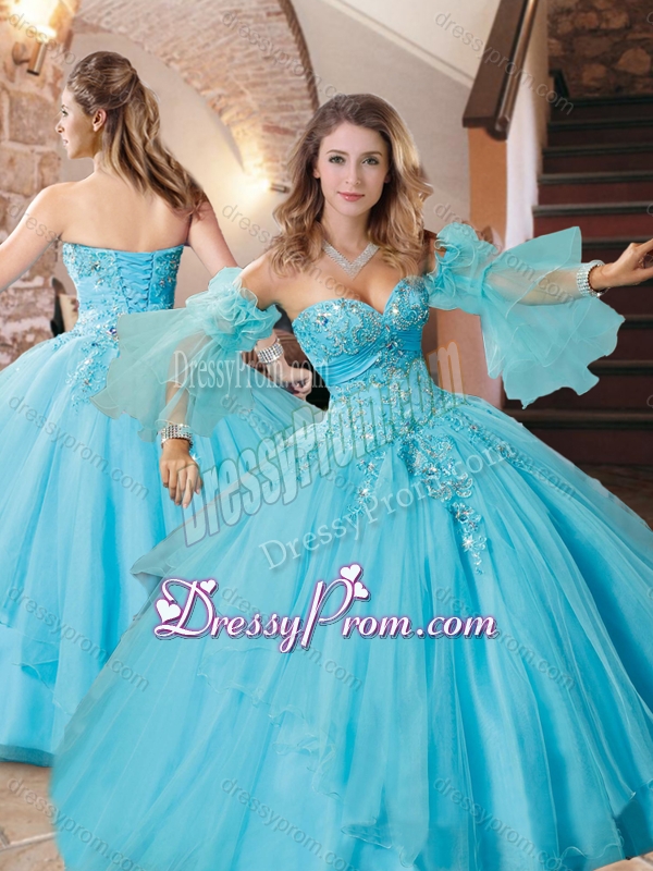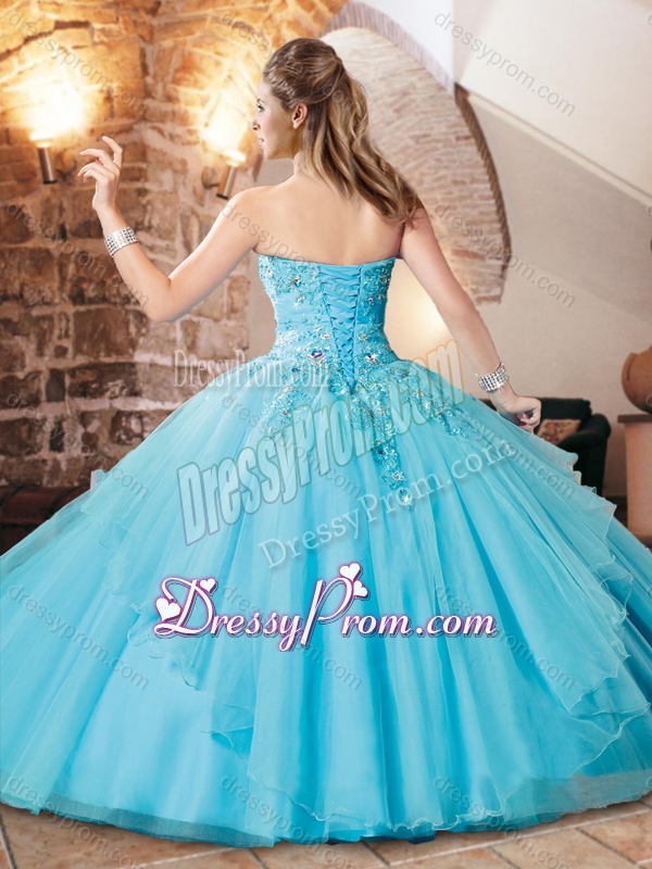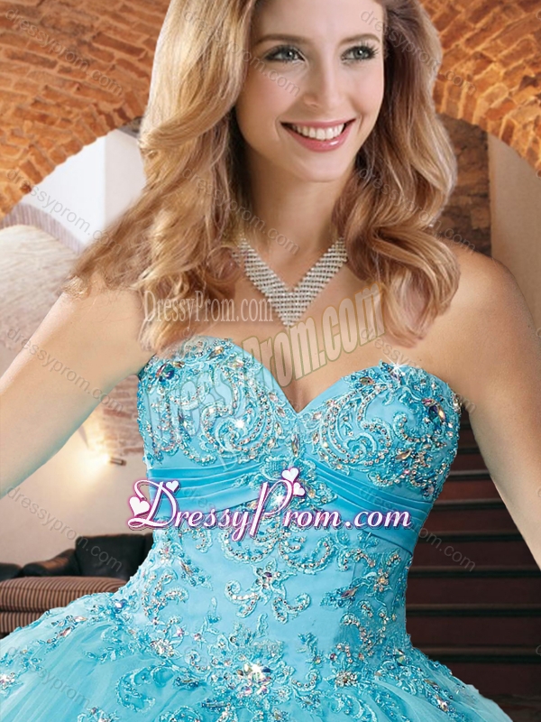 Neckline : SweetheartShown Color : Aqua BlueSilhouette : Ball GownsSleeve Length : sleevelessHemline : floor lengthBack Detail : Lace upFabric : OrganzaEmbellishment : Beading,AppliquesOccasion : Military Ball,Sweet 16,QuinceaneraSeason : Spring,Summer,Fall,Winter