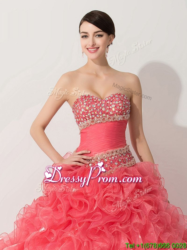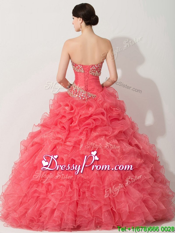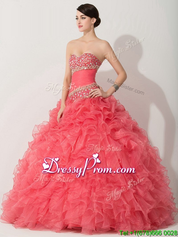 Neckline : SweetheartShown Color : Coral RedSilhouette : A-lineSleeve Length : sleevelessHemline : floor lengthBack Detail : Lace upFabric : OrganzaEmbellishment : Beading,RufflesOccasion : Military Ball,Sweet 16,QuinceaneraSeason : Spring,Summer,Fall,Winter
