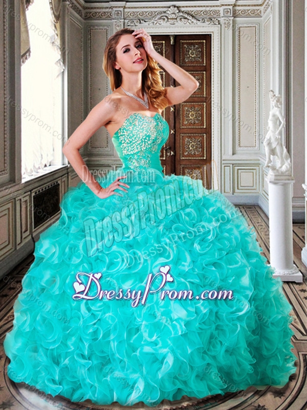 Neckline : SweetheartShown Color : TurquoiseSilhouette : Ball GownsSleeve Length : sleevelessHemline : floor lengthBack Detail : Lace upFabric : OrganzaEmbellishment : Beading,RufflesOccasion : Military Ball,Sweet 16,QuinceaneraSeason : Spring,Summer,Fall,Winter