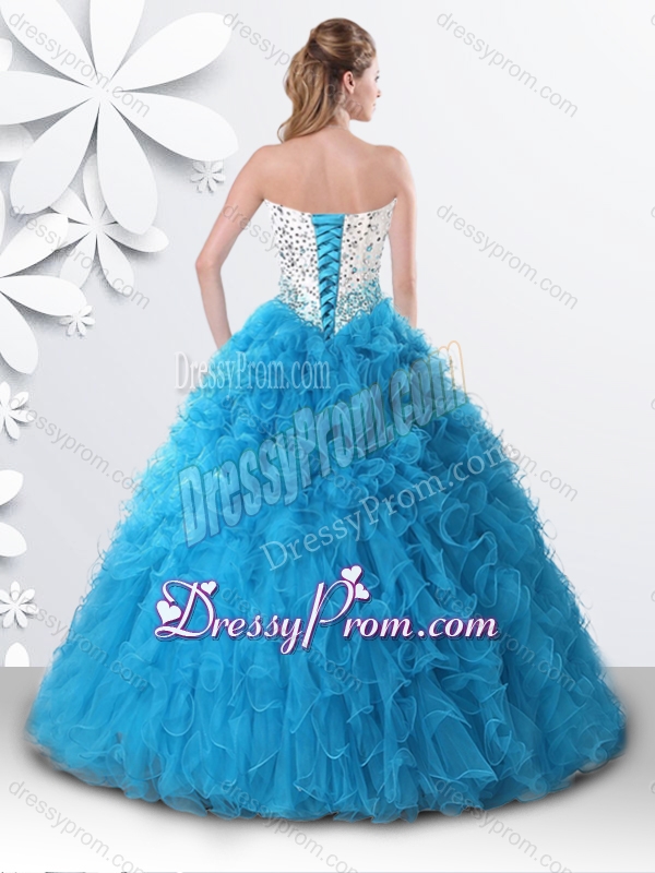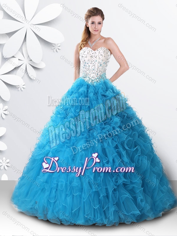 Neckline : SweetheartShown Color : Teal Silhouette : A-lineSleeve Length : sleevelessHemline : floor lengthBack Detail : Lace upFabric : OrganzaEmbellishment : Beading,RufflesOccasion : Military Ball,Sweet 16,QuinceaneraSeason : Spring,Summer,Fall,Winter