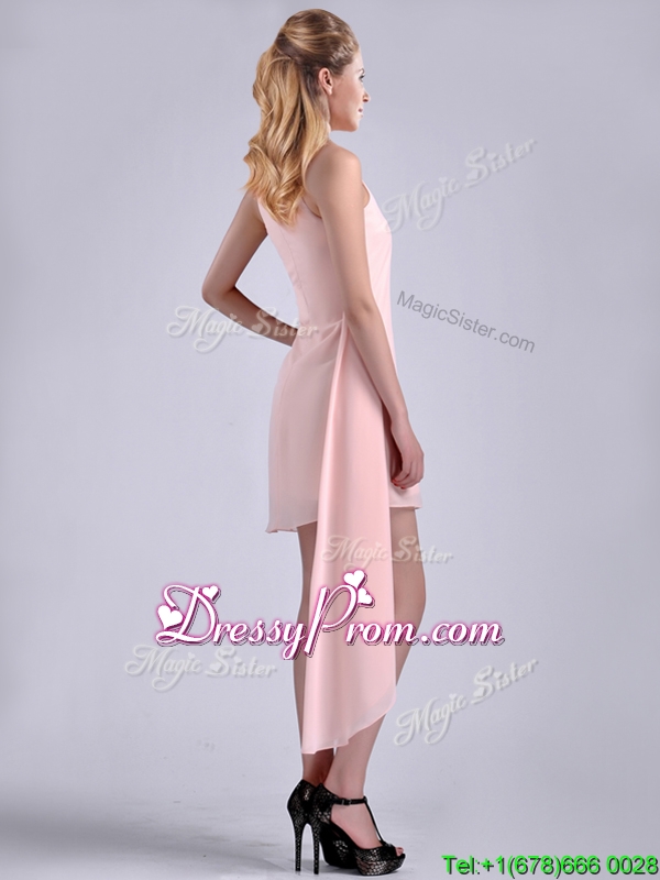 Neckline : ScoopShown Color : Baby PinkSilhouette : EmpireSleeve Length : sleevelessHemline : asymmetricalBack Detail : ZipperFabric : ChiffonEmbellishment : RuchingOccasion : Prom,Party,Cocktail,Homecoming,GraduationSeason : Spring,Summer,Fall
