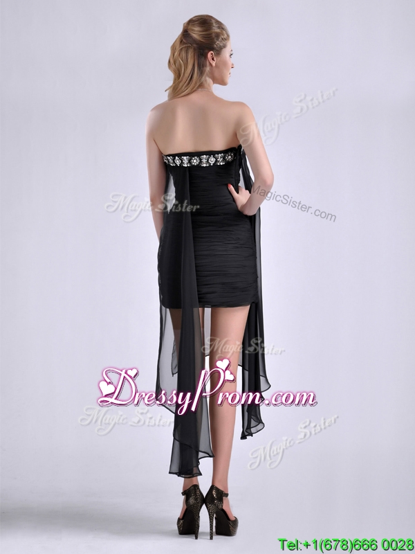 Neckline : StraplessShown Color : BlackSilhouette : Column/SheathSleeve Length : sleevelessHemline : asymmetricalBack Detail : Side zipperFabric : ChiffonEmbellishment : Beading,RuchingOccasion : Prom,Party,Cocktail,Homecoming,GraduationSeason : Spring,Summer,Fall