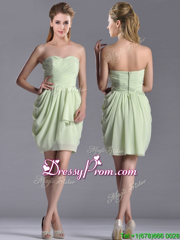 Neckline : SweetheartShown Color : Yellow GreenSilhouette : ShortSleeve Length : sleevelessHemline : mini lengthBack Detail : ZipperFabric : ChiffonEmbellishment : RuchingOccasion : Prom,Party,Cocktail,Homecoming,GraduationSeason : Spring,Summer,Fall