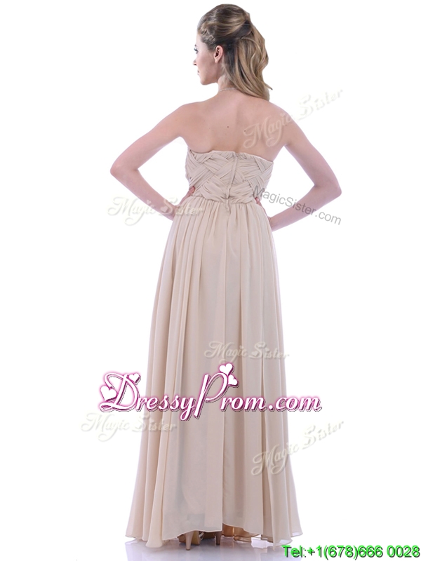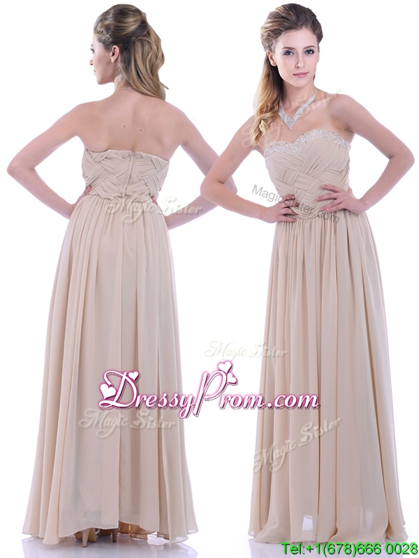 Neckline : SweetheartShown Color : ChampagneSilhouette : EmpireSleeve Length : sleevelessHemline : floor lengthBack Detail : ZipperFabric : ChiffonEmbellishment : Beading,RuchingOccasion : Prom,Formal Evening,Homecoming,Graduation,PageantSeason : Spring,Summer,Fall,Winter