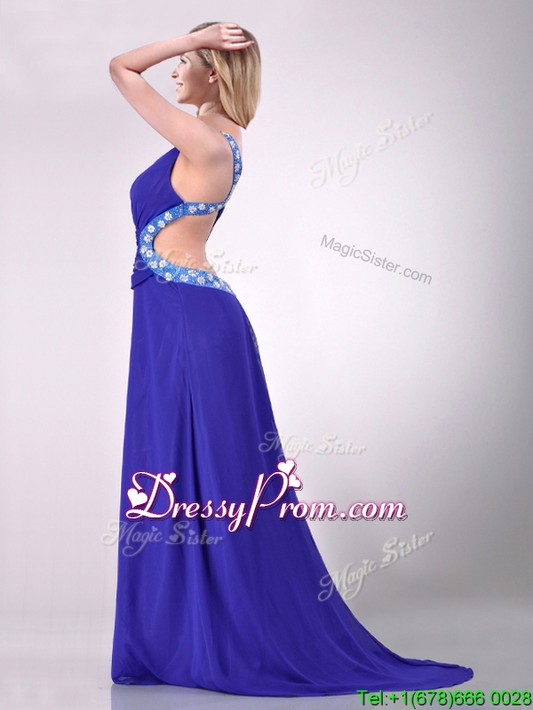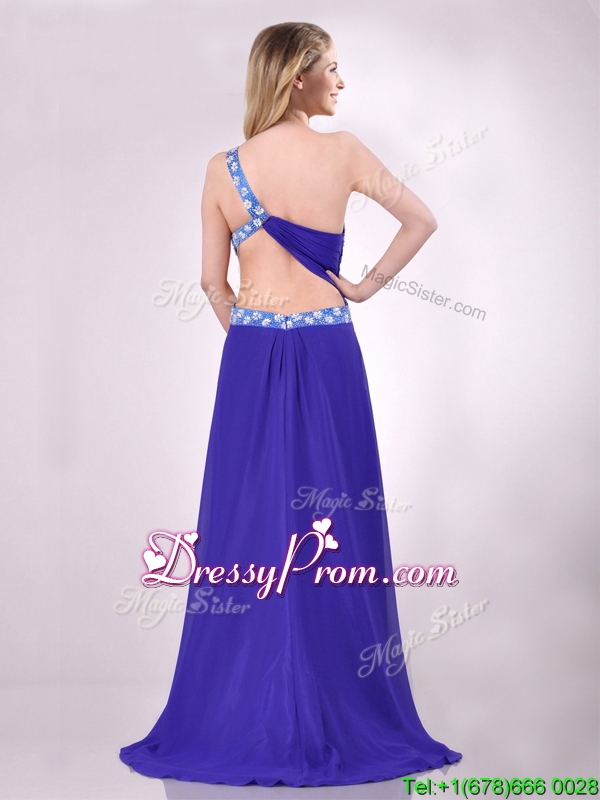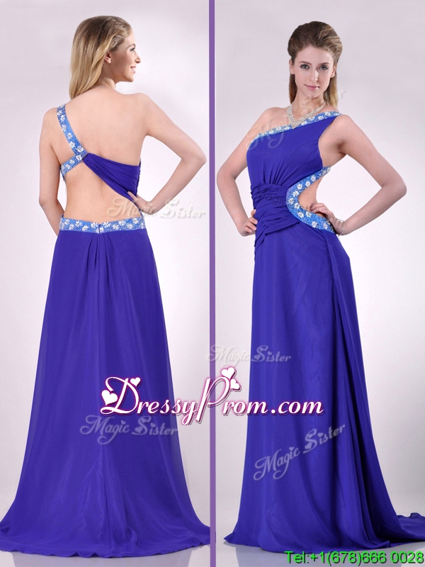 Neckline : One shoulderShown Color : BlueSilhouette : EmpireSleeve Length : sleevelessBack Detail : Criss crossFabric : ChiffonEmbellishment : BeadingOccasion : Prom,Formal Evening,Homecoming,Graduation,PageantSeason : Spring,Summer,Fall,Winter