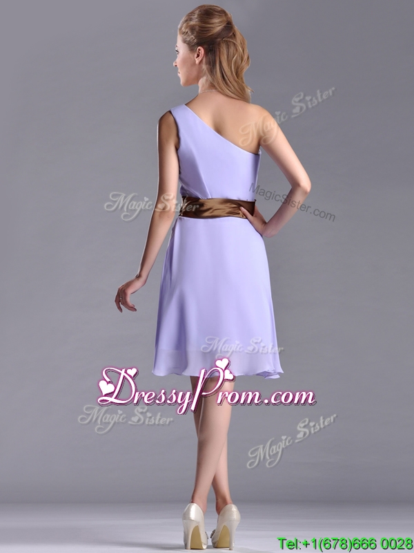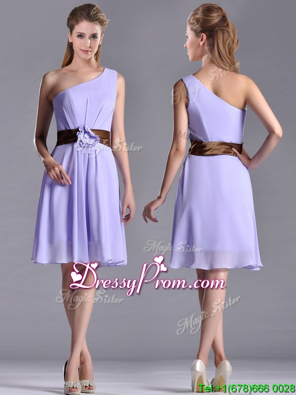 Neckline : One shoulderShown Color : LavenderSilhouette : EmpireSleeve Length : sleevelessHemline : knee lengthBack Detail : Side zipperFabric : ChiffonEmbellishment : BeltOccasion : Prom,Party,Cocktail,Homecoming,GraduationSeason : Spring,Summer,Fall