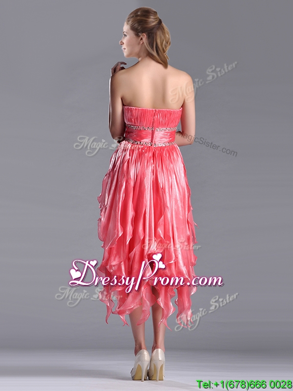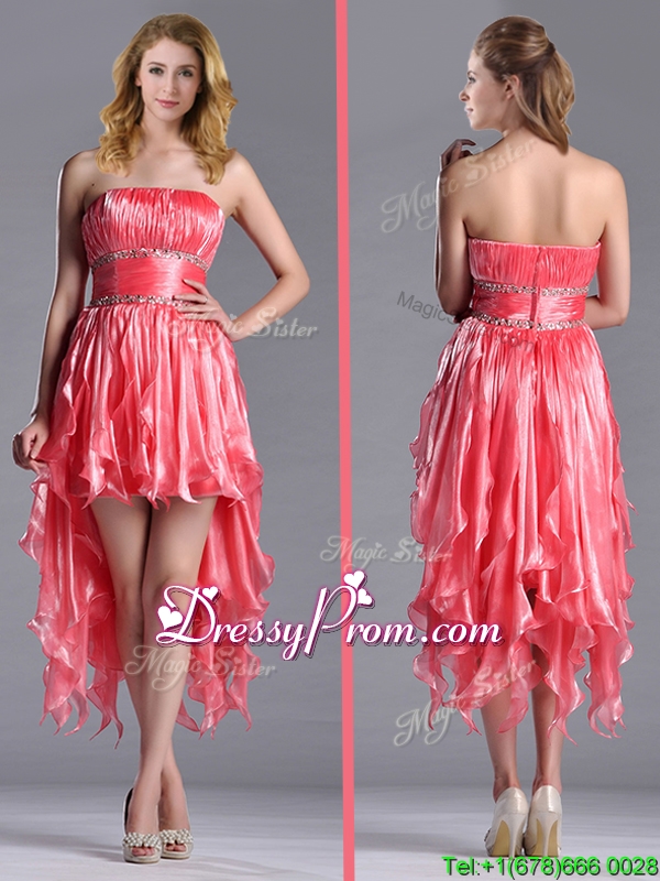 Neckline : StraplessShown Color : Coral RedSilhouette : EmpireSleeve Length : sleevelessHemline : high lowBack Detail : ZipperFabric : OrganzaEmbellishment : BeadingOccasion : Prom,Party,Cocktail,Homecoming,GraduationSeason : Spring,Summer,Fall
