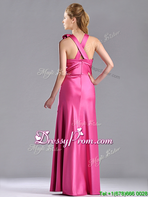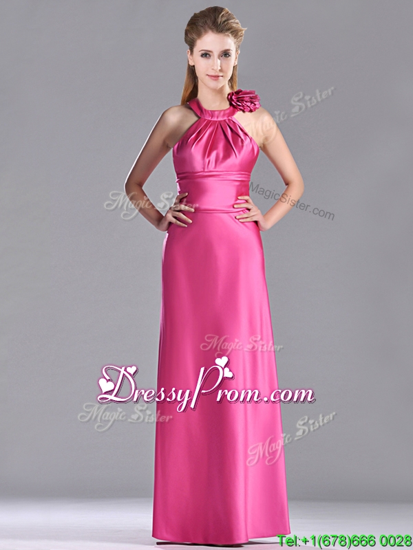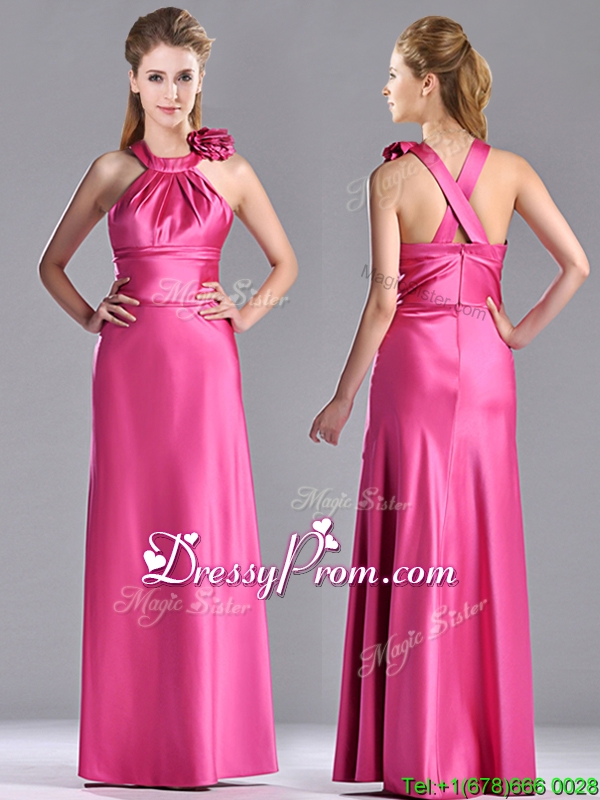 Neckline : Halter topShown Color : Hot PinkSilhouette : Column/SheathSleeve Length : sleevelessHemline : floor lengthBack Detail : Criss crossFabric : Elastic Woven SatinEmbellishment : Hand Made FlowerOccasion : Prom,Formal Evening,Homecoming,Graduation,PageantSeason : Spring,Summer,Fall,Winter