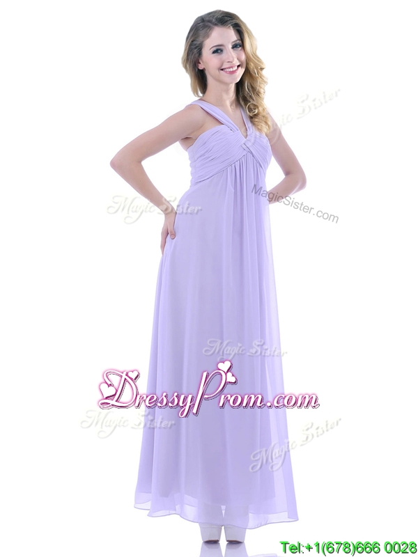 Neckline : V-neckShown Color : LavenderSilhouette : EmpireSleeve Length : sleevelessHemline : ankle lengthBack Detail : ZipperFabric : ChiffonEmbellishment : RuchingOccasion : Prom,Formal Evening,Homecoming,Graduation,PageantSeason : Spring,Summer,Fall,Winter