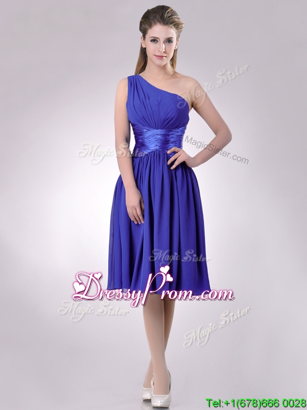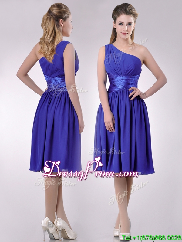 Neckline : One shoulderShown Color : BlueSilhouette : EmpireSleeve Length : sleevelessHemline : tea lengthBack Detail : Side zipperFabric : ChiffonEmbellishment : RuchingOccasion : Prom,Formal Evening,Homecoming,Graduation,PageantSeason : Spring,Summer,Fall,Winter