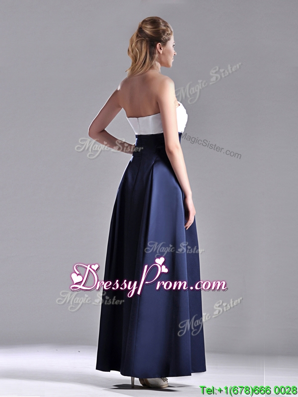 Neckline : StraplessShown Color : White,Navy BlueSilhouette : EmpireSleeve Length : sleevelessHemline : ankle lengthBack Detail : ZipperFabric : TaffetaEmbellishment : RuchingOccasion : Prom,Formal Evening,Homecoming,Graduation,PageantSeason : Spring,Summer,Fall,Winter