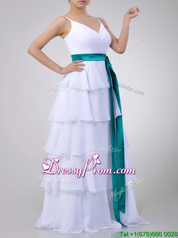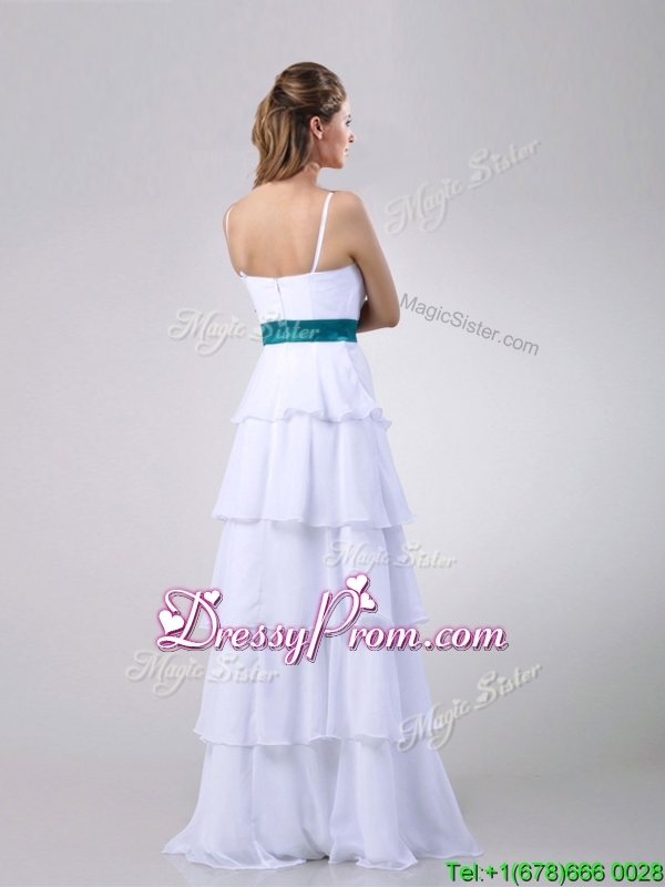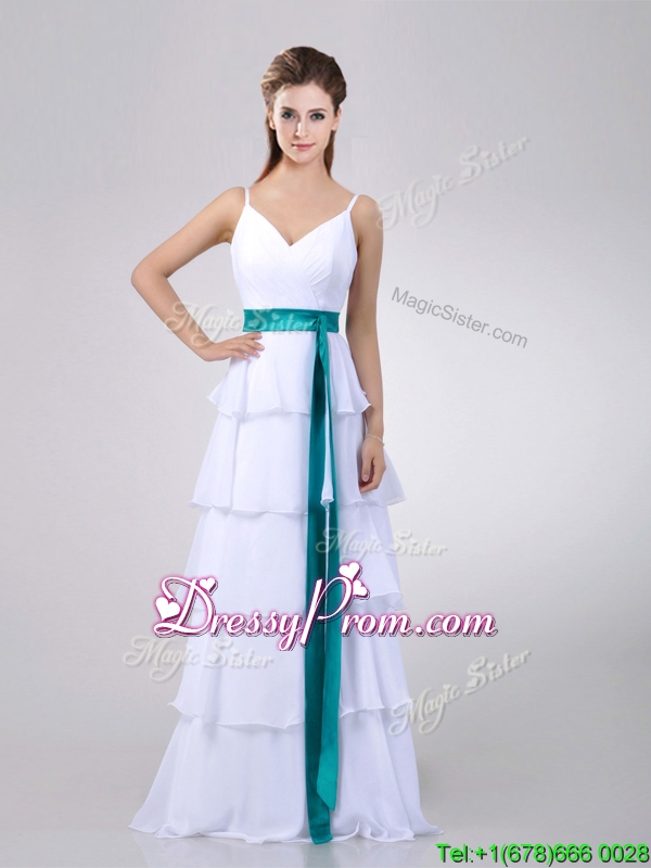 Neckline : Spaghetti strapsShown Color : WhiteSilhouette : EmpireSleeve Length : sleevelessHemline : floor lengthBack Detail : ZipperFabric : ChiffonEmbellishment : Ruffled Layers,BeltOccasion : Prom,Formal Evening,Homecoming,Graduation,PageantSeason : Spring,Summer,Fall,Winter