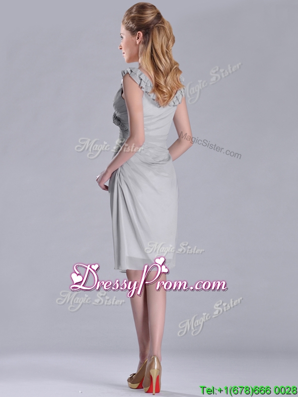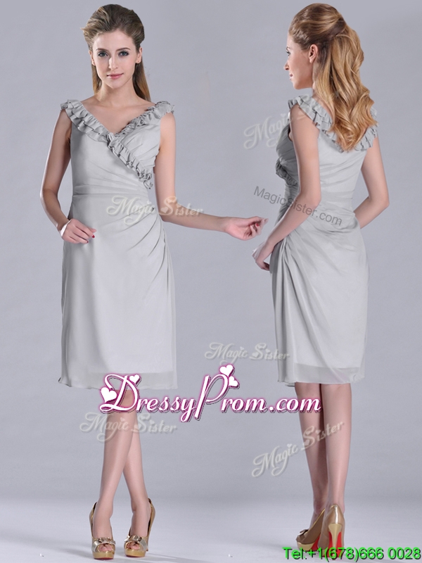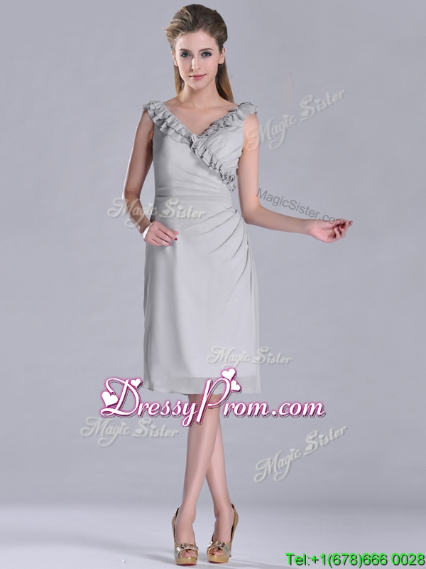 Neckline : V-neckShown Color : GreySilhouette : EmpireSleeve Length : sleevelessHemline : knee lengthBack Detail : Side zipperFabric : ChiffonEmbellishment : RufflesOccasion : Prom,Party,Cocktail,Homecoming,GraduationSeason : Spring,Summer,Fall