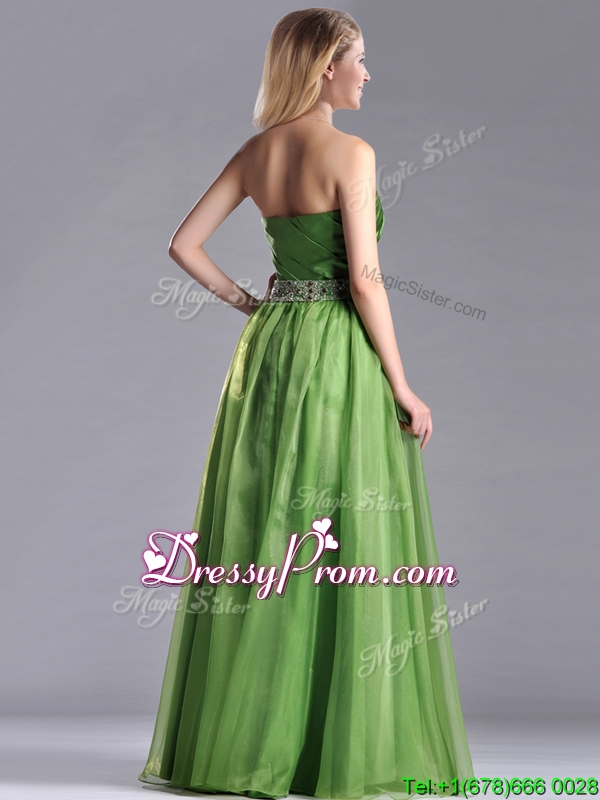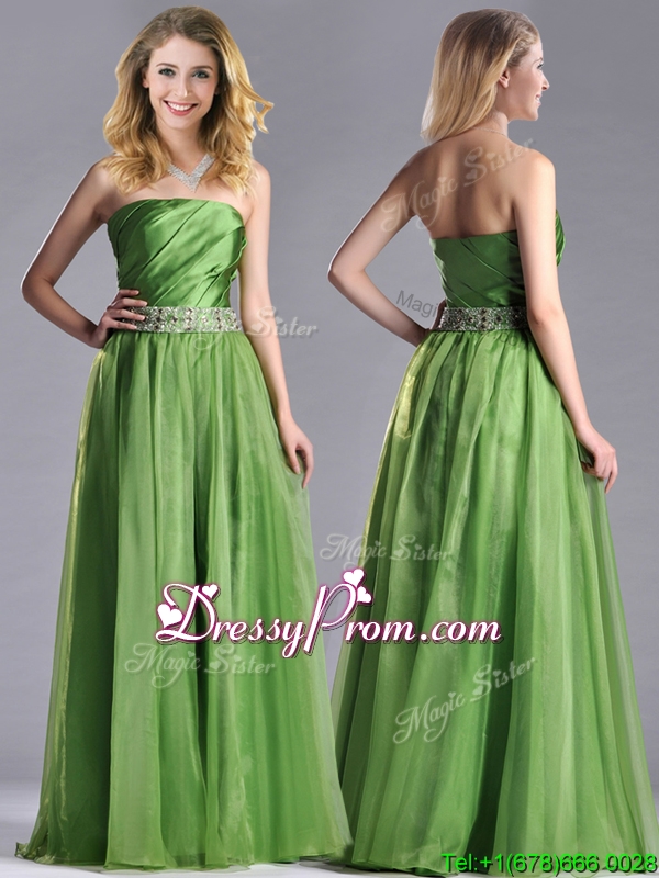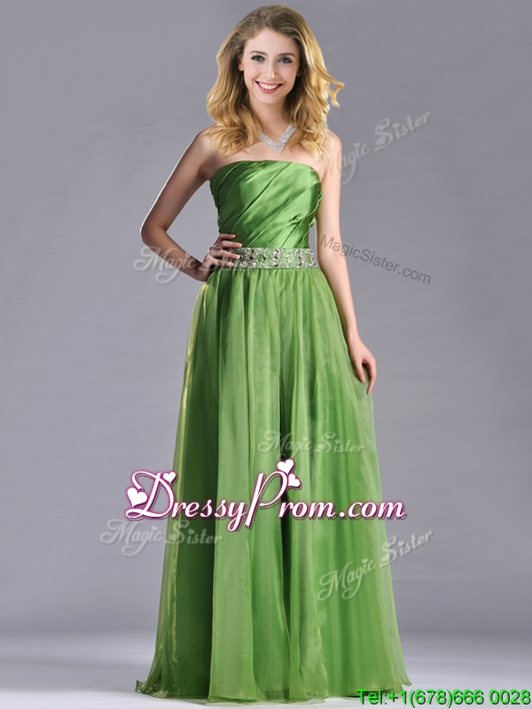 Neckline : StraplessShown Color : GreenSilhouette : EmpireSleeve Length : sleevelessHemline : floor lengthBack Detail : Side zipperFabric : OrganzaEmbellishment : BeadingOccasion : Prom,Formal Evening,Homecoming,Graduation,PageantSeason : Spring,Summer,Fall,Winter
