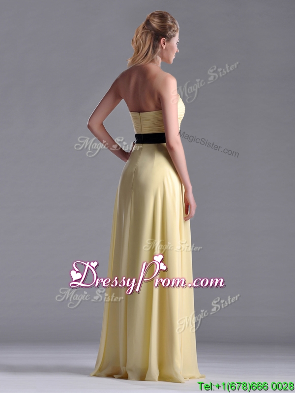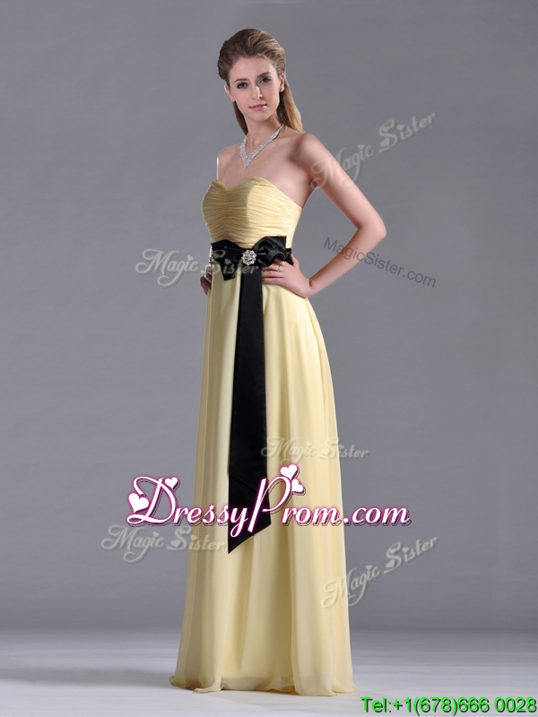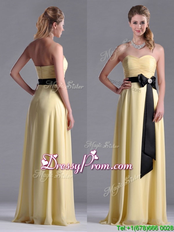 Neckline : SweetheartShown Color : YellowSilhouette : EmpireSleeve Length : sleevelessHemline : floor lengthBack Detail : ZipperFabric : ChiffonEmbellishment : Ruching,BowknotOccasion : Prom,Formal Evening,Homecoming,Graduation,PageantSeason : Spring,Summer,Fall,Winter