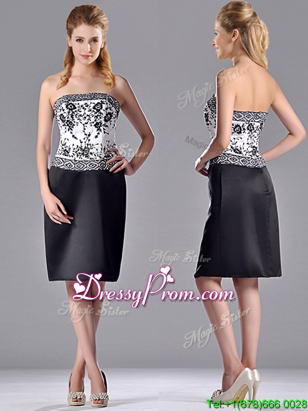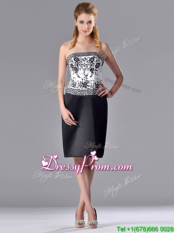 Neckline : StraplessShown Color : White And BlackSilhouette : Column/SheathSleeve Length : sleevelessHemline : knee lengthBack Detail : ZipperFabric : TaffetaEmbellishment : EmbroideryOccasion : Prom,Party,Cocktail,Homecoming,GraduationSeason : Spring,Summer,Fall
