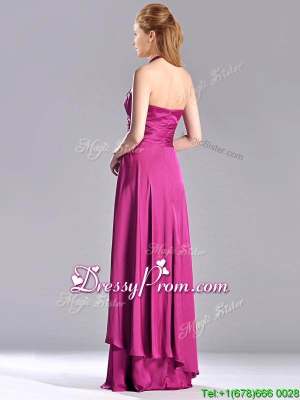 Neckline : Halter topShown Color : FuchsiaSilhouette : EmpireSleeve Length : sleevelessHemline : floor lengthBack Detail : ZipperFabric : Elastic Woven SatinEmbellishment : RuchingOccasion : Prom,Formal Evening,Homecoming,Graduation,PageantSeason : Spring,Summer,Fall,Winter