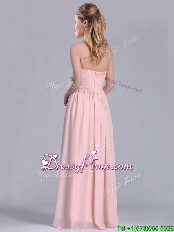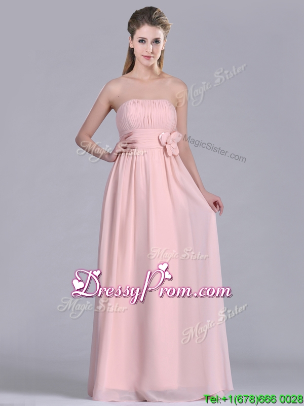 Neckline : StraplessShown Color : Baby PinkSleeve Length : sleevelessHemline : floor lengthBack Detail : ZipperFabric : ChiffonEmbellishment : Ruching,Hand Made FlowerOccasion : Prom,Formal Evening,Homecoming,Graduation,PageantSeason : Spring,Summer,Fall,Winter