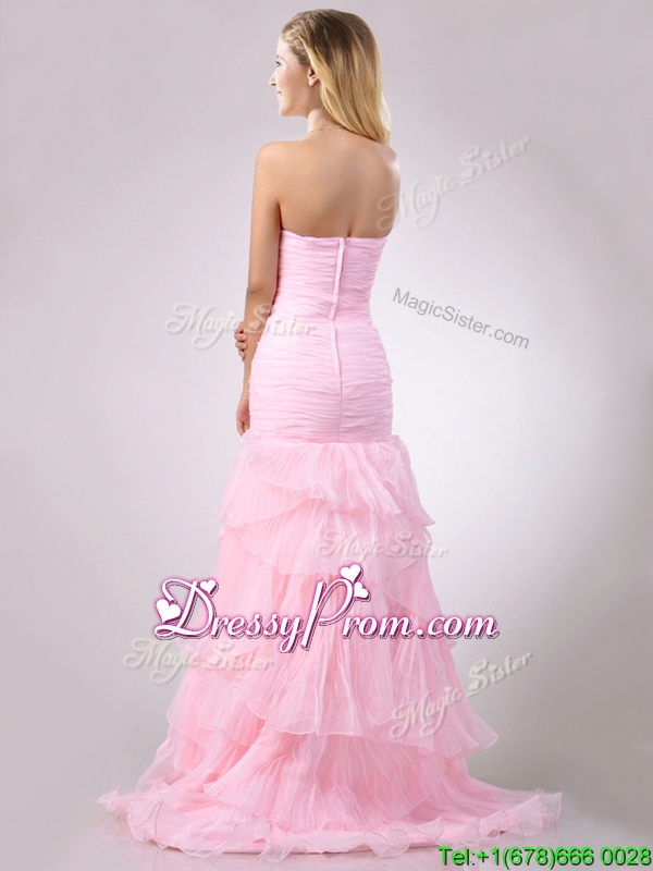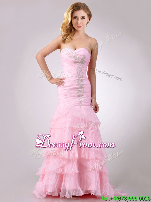 Neckline : SweetheartShown Color : Pink Sleeve Length : sleevelessBack Detail : ZipperFabric : OrganzaEmbellishment : Beading,RufflesOccasion : Prom,Formal Evening,Homecoming,Graduation,PageantSeason : Spring,Summer,Fall,Winter