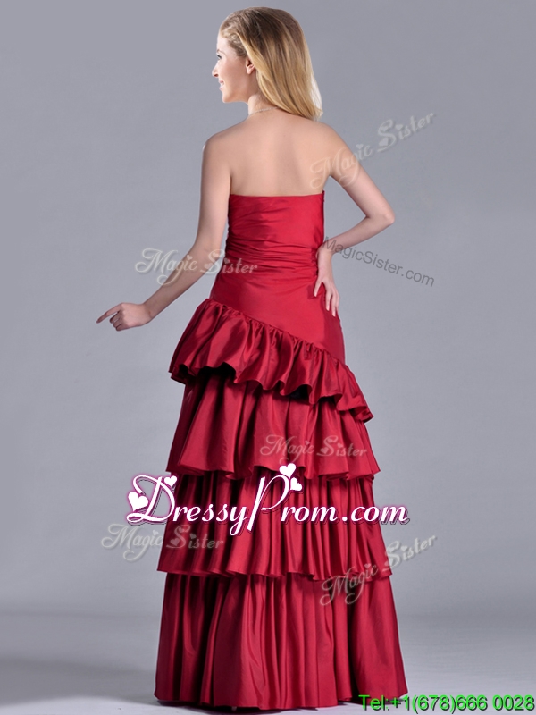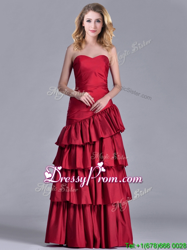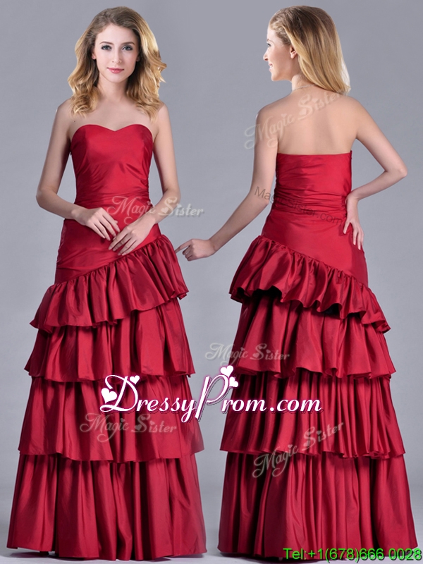 Neckline : SweetheartShown Color : Wine RedSilhouette : A-lineSleeve Length : sleevelessHemline : floor lengthBack Detail : Side zipperFabric : TaffetaEmbellishment : Ruffled LayersOccasion : Prom,Formal Evening,Homecoming,Graduation,PageantSeason : Spring,Summer,Fall,Winter