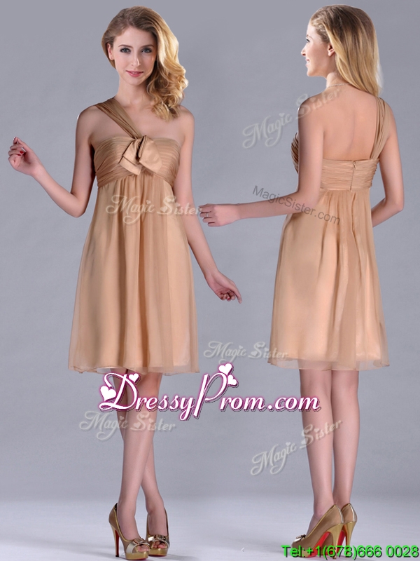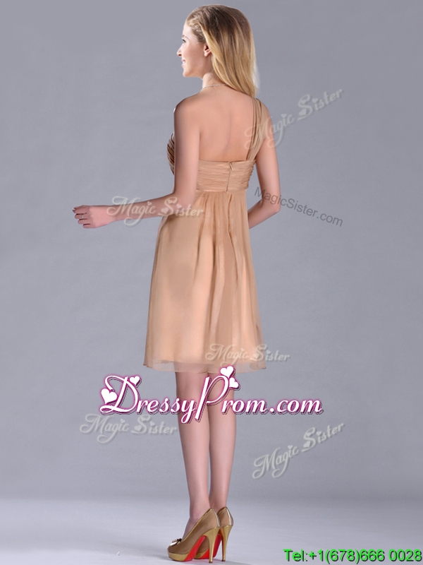 Neckline : One shoulderShown Color : ChampagneSilhouette : EmpireSleeve Length : sleevelessHemline : knee lengthBack Detail : ZipperFabric : ChiffonEmbellishment : RuchingOccasion : Prom,Party,Cocktail,Homecoming,GraduationSeason : Spring,Summer,Fall