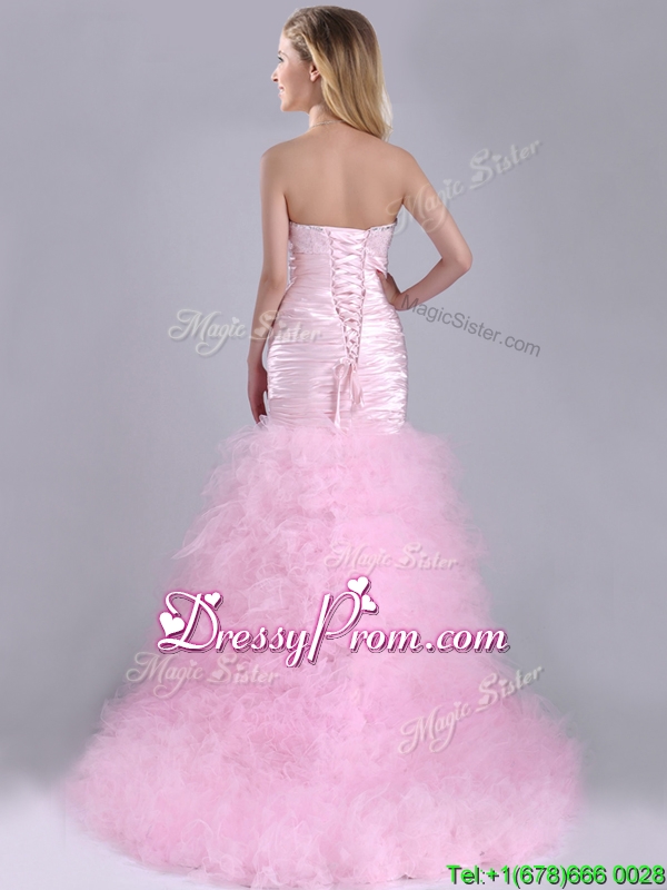 Neckline : SweetheartShown Color : Baby PinkSleeve Length : sleevelessHemline : floor lengthBack Detail : Lace upFabric : Taffeta,TulleEmbellishment : Beading,Ruffles,SequinsOccasion : Prom,Formal Evening,Homecoming,Graduation,PageantSeason : Spring,Summer,Fall,Winter