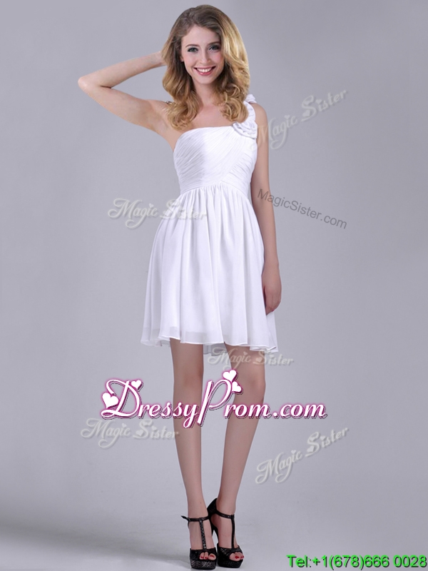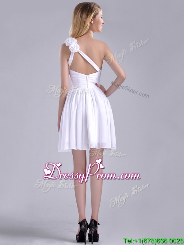 Neckline : One shoulder Shown Color : White Silhouette : Empire Sleeve Length : sleeveless Hemline : mini length Back Detail : Criss cross Fabric : Chiffon Embellishment : Hand Made Flower Occasion : Prom,Party,Cocktail,Homecoming,Graduation Season : Spring,Summer,Fall