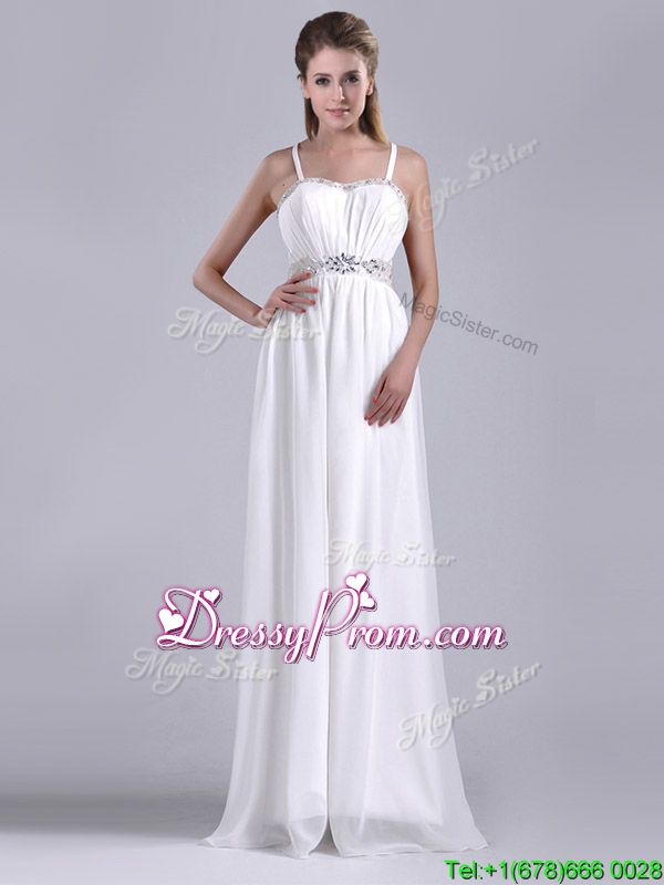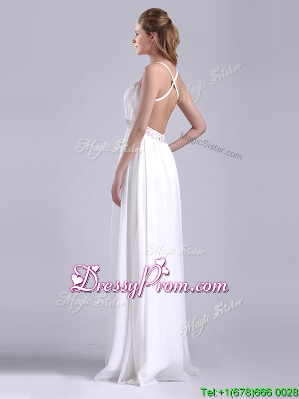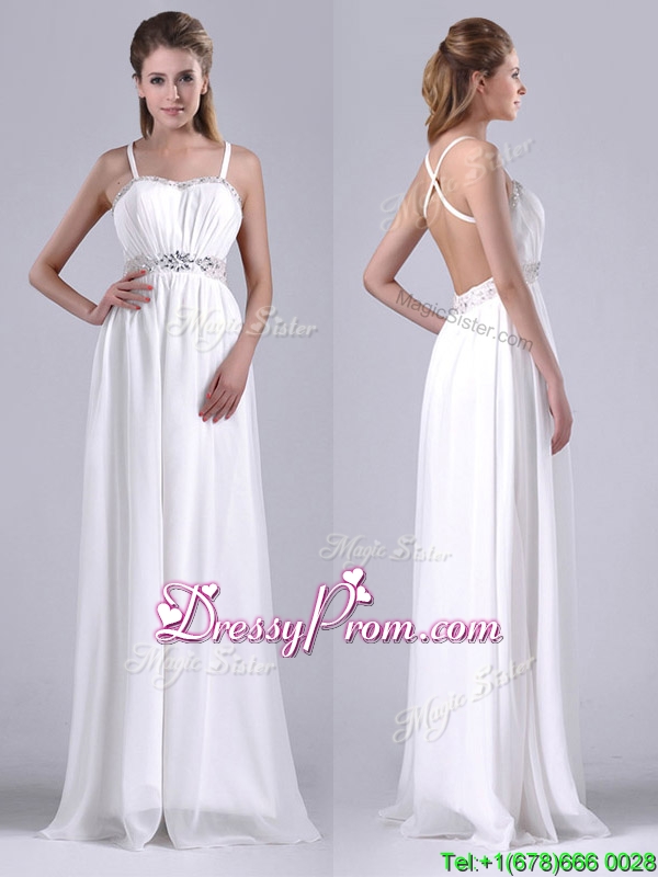 Neckline : StrapsShown Color : WhiteSilhouette : EmpireSleeve Length : sleevelessHemline : floor lengthBack Detail : Criss crossFabric : ChiffonEmbellishment : BeadingOccasion : Prom,Formal Evening,Homecoming,Graduation,PageantSeason : Spring,Summer,Fall,Winter