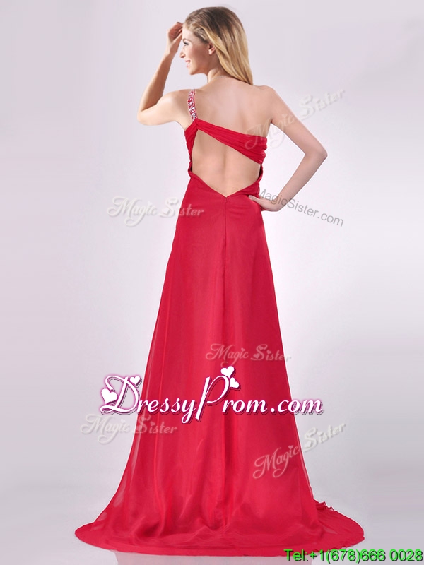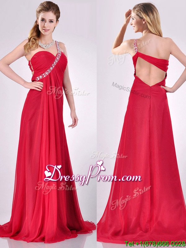 Neckline : One shoulderShown Color : RedSleeve Length : sleevelessBack Detail : Criss crossFabric : ChiffonEmbellishment : Beading,RuchingOccasion : Prom,Formal Evening,Homecoming,Graduation,PageantSeason : Spring,Summer,Fall,Winter