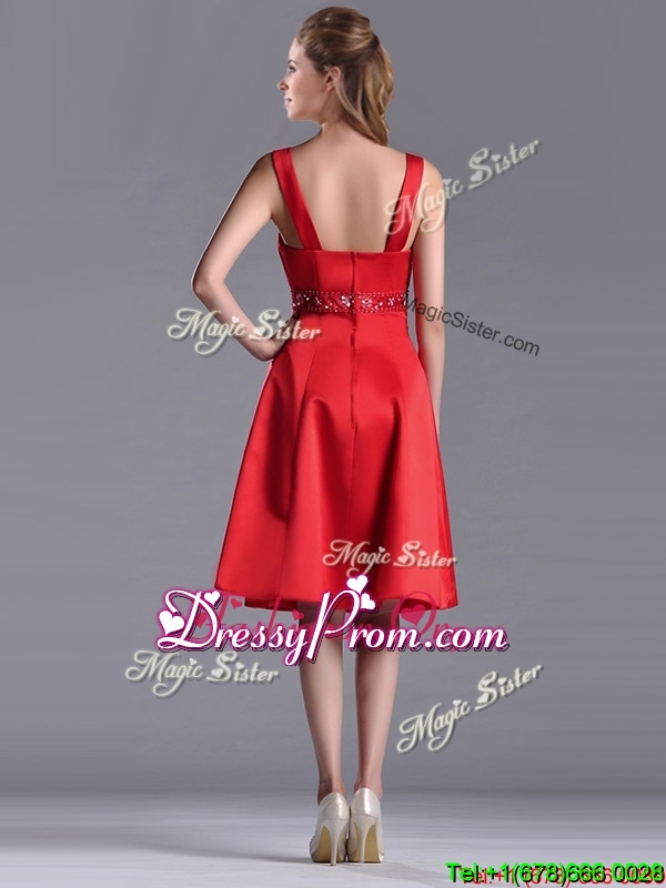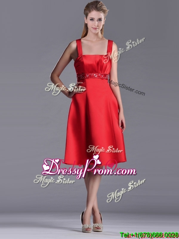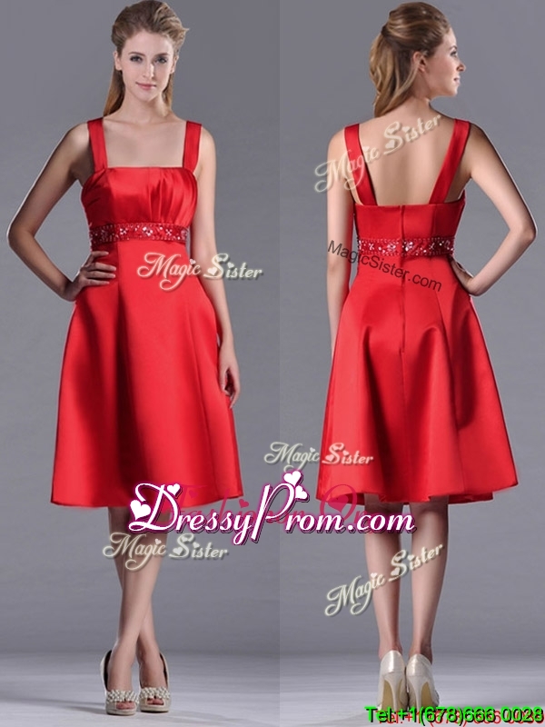 Neckline : SquareShown Color : RedSilhouette : EmpireSleeve Length : sleevelessHemline : knee lengthBack Detail : ZipperFabric : Elastic Woven SatinEmbellishment : BeadingOccasion : Prom,Party,Cocktail,Homecoming,GraduationSeason : Spring,Summer,Fall