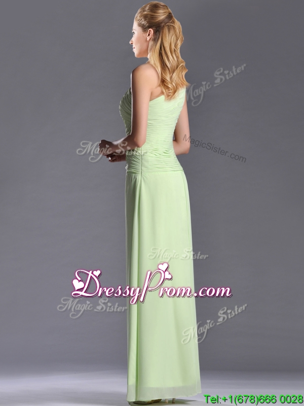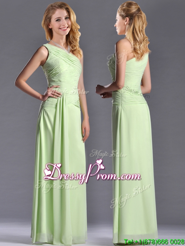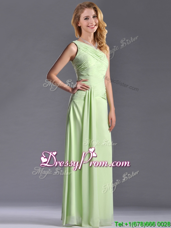 Neckline : One shoulderShown Color : Yellow GreenSilhouette : EmpireSleeve Length : sleevelessHemline : floor lengthBack Detail : Side zipperFabric : ChiffonEmbellishment : RuchingOccasion : Prom,Formal Evening,Homecoming,Graduation,PageantSeason : Spring,Summer,Fall,Winter