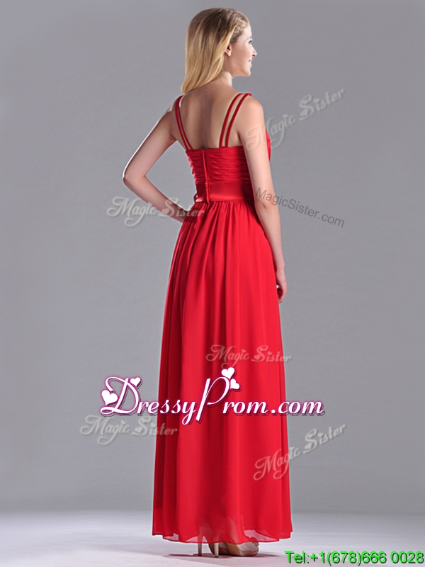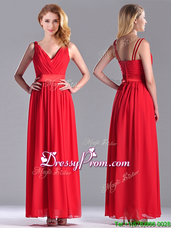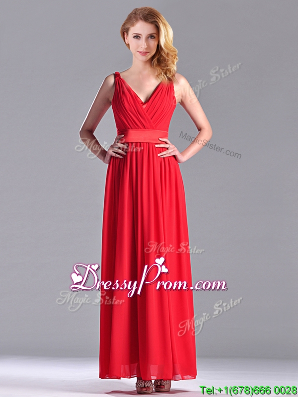 Neckline : V-neckShown Color : RedSilhouette : EmpireSleeve Length : sleevelessHemline : ankle lengthBack Detail : ZipperFabric : ChiffonEmbellishment : RuchingOccasion : Prom,Formal Evening,Homecoming,Graduation,PageantSeason : Spring,Summer,Fall,Winter