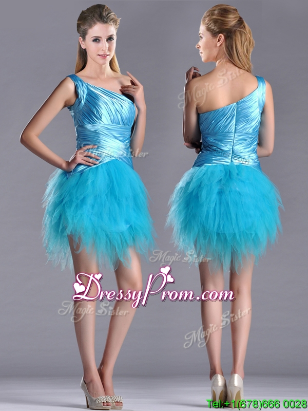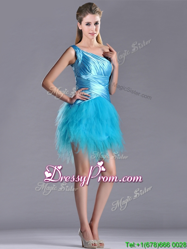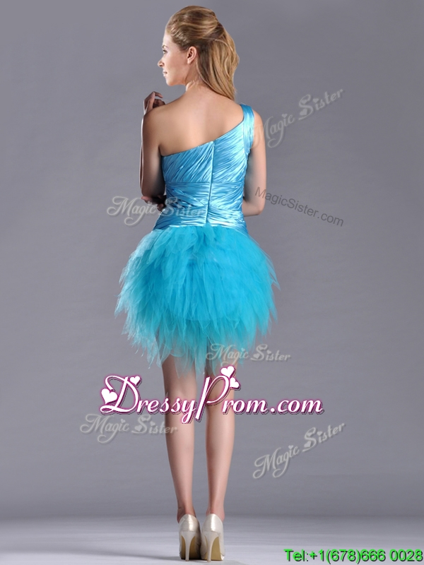 Neckline : One shoulderShown Color : Aqua BlueSilhouette : Ball GownsSleeve Length : sleevelessHemline : mini lengthBack Detail : ZipperFabric : TulleEmbellishment : Ruffles,RuchingOccasion : Prom,Party,Cocktail,Homecoming,GraduationSeason : Spring,Summer,Fall