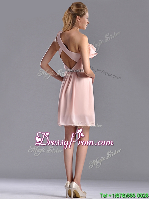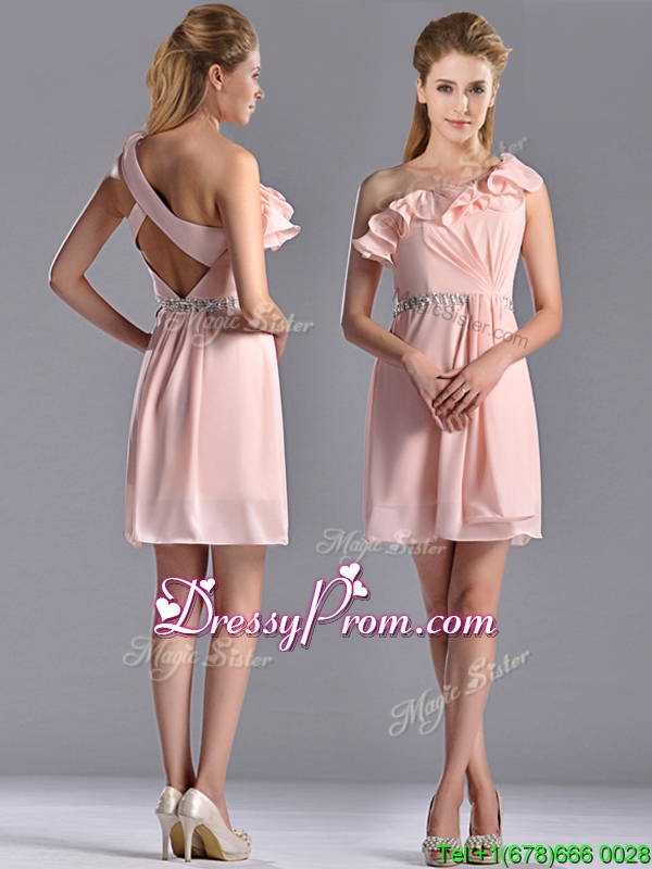 Neckline : One shoulderShown Color : Pink Silhouette : EmpireSleeve Length : sleevelessHemline : mini lengthBack Detail : Criss crossFabric : ChiffonEmbellishment : Beading,RufflesOccasion : Prom,Party,Cocktail,Homecoming,GraduationSeason : Spring,Summer,Fall