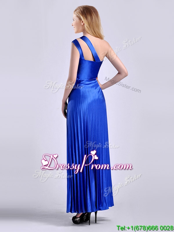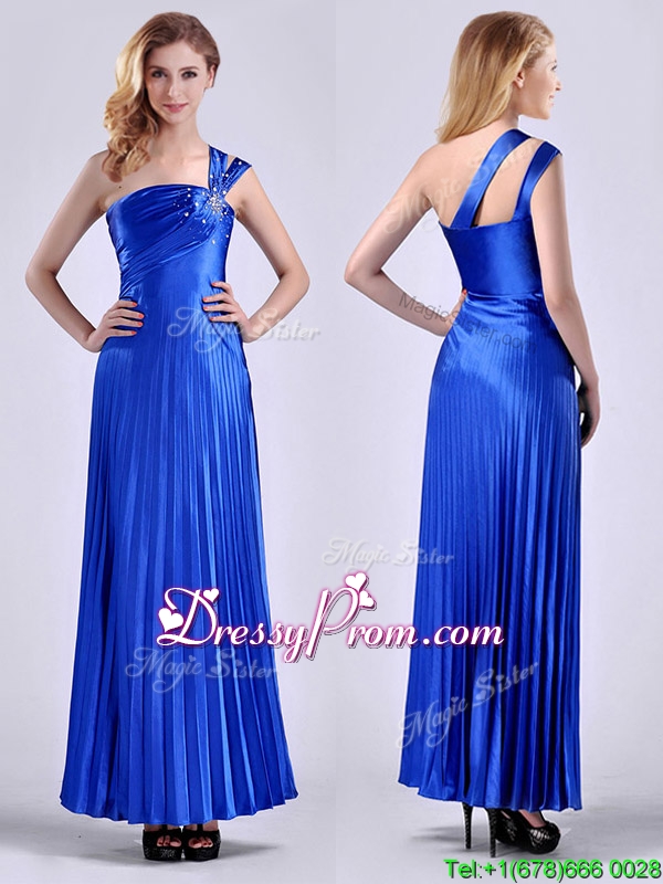 Neckline : One shoulderShown Color : Royal BlueSilhouette : EmpireSleeve Length : sleevelessHemline : ankle lengthBack Detail : Side zipperFabric : TaffetaEmbellishment : Beading,PleatedOccasion : Prom,Formal Evening,Homecoming,Graduation,PageantSeason : Spring,Summer,Fall,Winter
