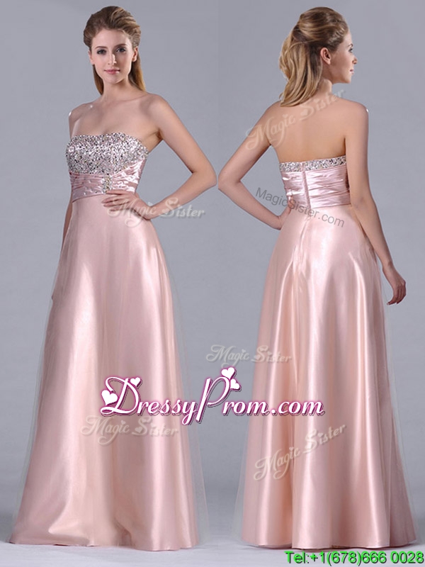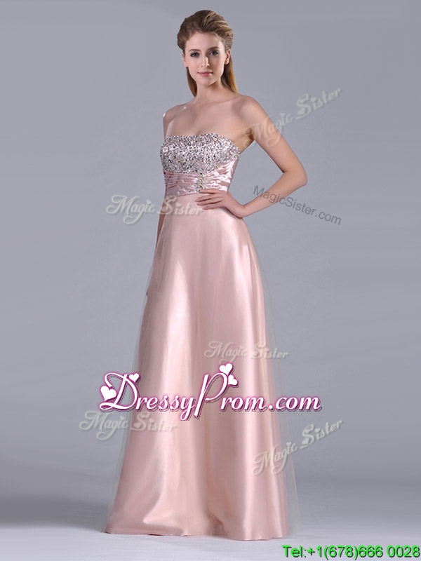 Neckline : StraplessShown Color : Pink Silhouette : EmpireSleeve Length : sleevelessHemline : floor lengthBack Detail : ZipperFabric : Elastic Woven Satin,TulleEmbellishment : BeadingOccasion : Prom,Formal Evening,Homecoming,Graduation,PageantSeason : Spring,Summer,Fall,Winter