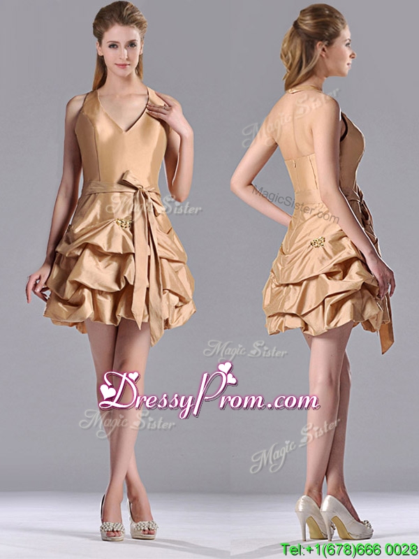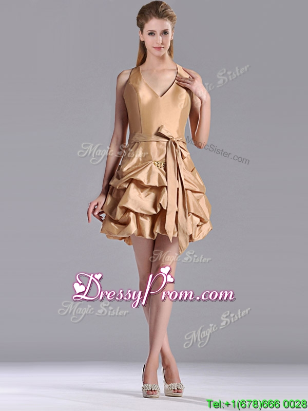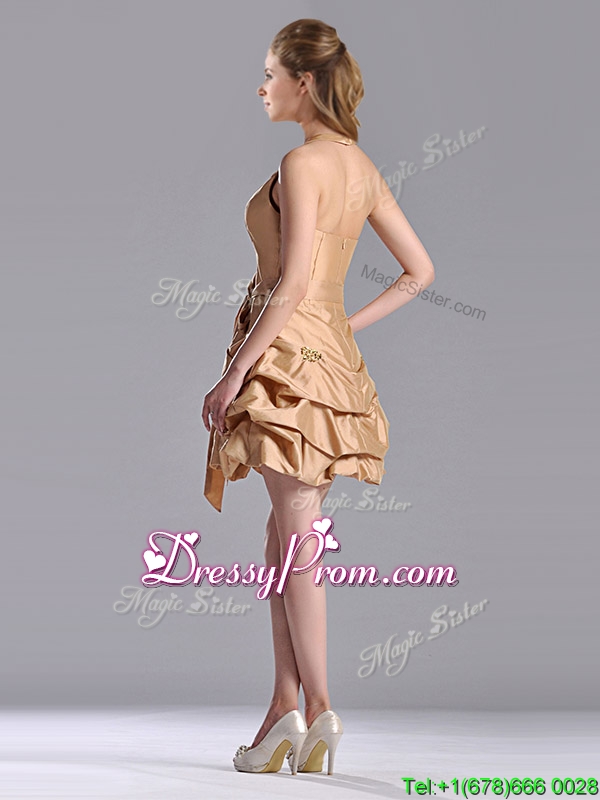 Neckline : Halter topShown Color : ChampagneSilhouette : A-lineSleeve Length : sleevelessHemline : mini lengthBack Detail : ZipperFabric : TaffetaEmbellishment : Beading,Pick Ups,BowknotOccasion : Prom,Party,Cocktail,Homecoming,GraduationSeason : Spring,Summer,Fall