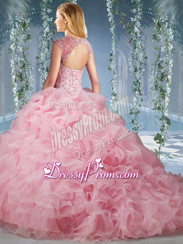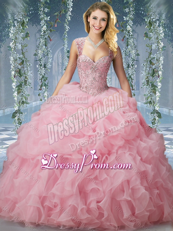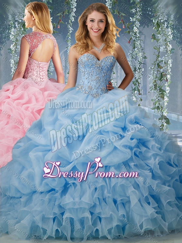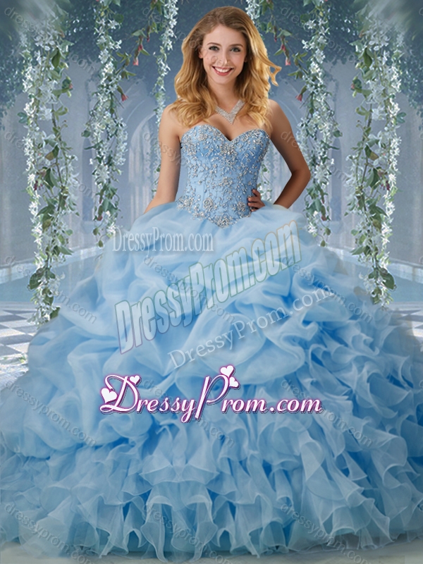 Neckline : SweetheartShown Color : Light BlueSilhouette : Ball GownsSleeve Length : sleevelessHemline : with trainBack Detail : Lace upFabric : OrganzaEmbellishment : Beading,RufflesOccasion : Military Ball,Sweet 16,QuinceaneraSeason : Spring,Summer,Fall,Winter