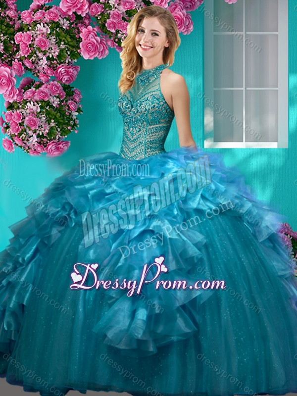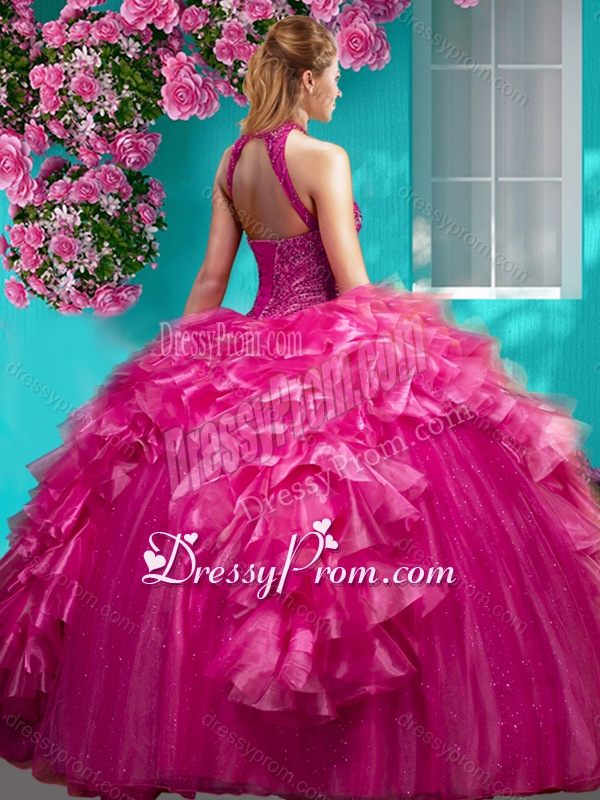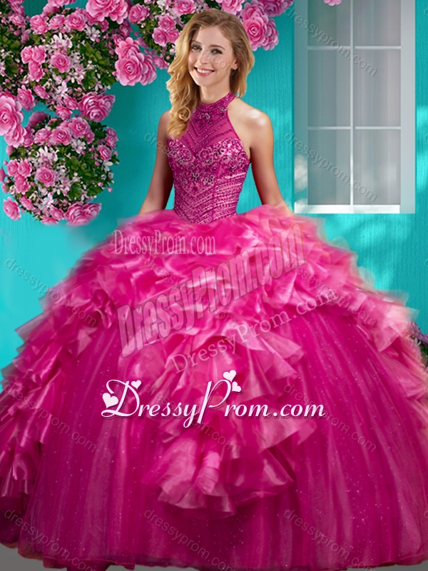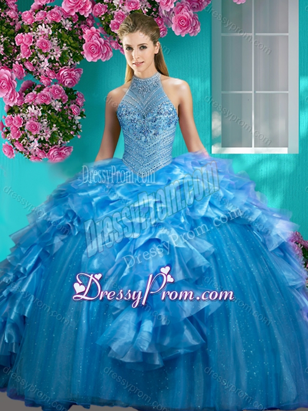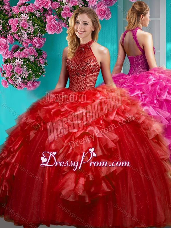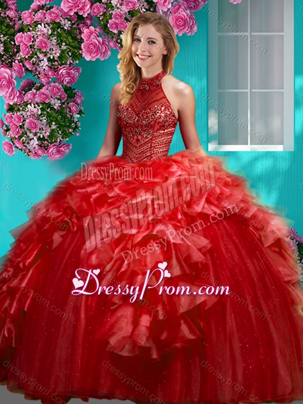 Neckline : Halter topShown Color : RedSilhouette : Ball GownsSleeve Length : sleevelessHemline : floor lengthBack Detail : Lace upFabric : Organza,TulleEmbellishment : Beading,RufflesOccasion : Military Ball,Sweet 16,QuinceaneraSeason : Spring,Summer,Fall,Winter