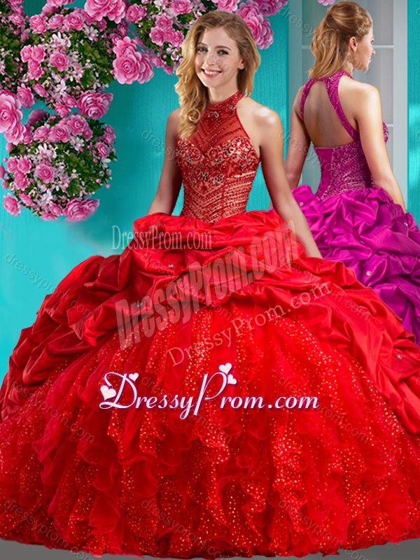 Neckline : Halter top Shown Color : Red Silhouette : Ball Gowns Sleeve Length : sleeveless Hemline : with train Back Detail : Lace up Fabric : Organza,Taffeta Embellishment : Beading,Ruffles Occasion : Military Ball,Sweet 16,Quinceanera Season : Spring,Summer,Fall,Winter